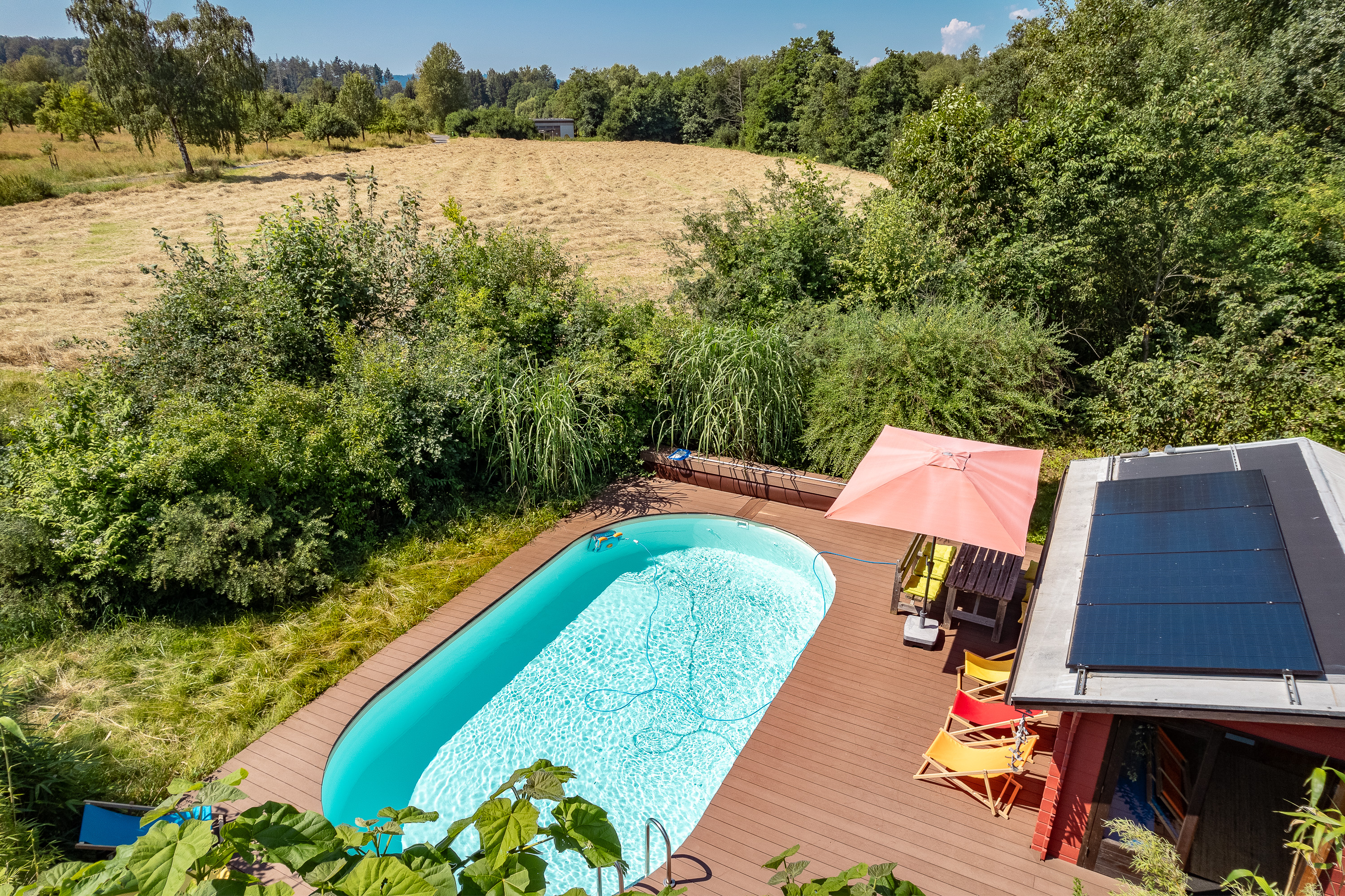 Das Highlight: Ein von außen nicht einsehbarer privater Swimmingpool und eine Gartensauna mit Dusche – absolute Privatsphäre für generationenübergreifende Entspannung.