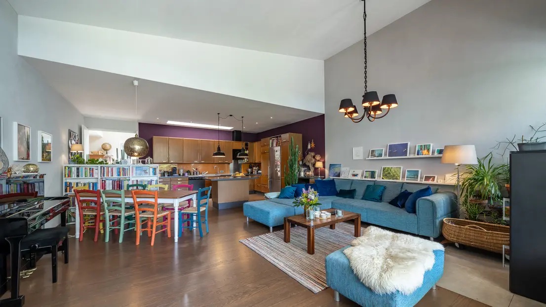 Zwei vollwertige Wohnungen (178 m² + 105 m²) mit lichtdurchfluteten Räumen durch große Fensterfronten und zwei Decken-Oberlichter. Die Aufteilung ist flexibel gestaltbar, da sie ursprünglich aus einer großen Wohnung entstanden.